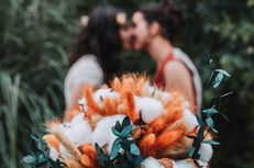 La cérémonie laïque s’est tenue dans le parc, sous un ciel lumineux. Deux grands fauteuils en rotin, décorés dans un style bohème, attendaient les mariées. J’ai adoré immortaliser ces instants de douceur et de complicité, où chaque détail avait été soigneusement pensé. L’émotion était palpable lors du rituel des liens : les poignets d’April et Claire ont été délicatement attachés, symbole fort de leur engagement l’une envers l’autre.